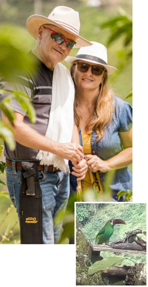 The Toucan (crimson rumped Toucanet) graces our coffee bags as a symbol of the exotic bird that lives on our farm. This was inspired by the magical moment when it perched in a tree in front of our house, during our branding journey.